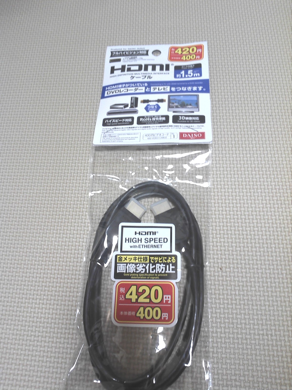 HDMIケーブルが必要になったので探しに行くとなんとダイソーで売っていました。